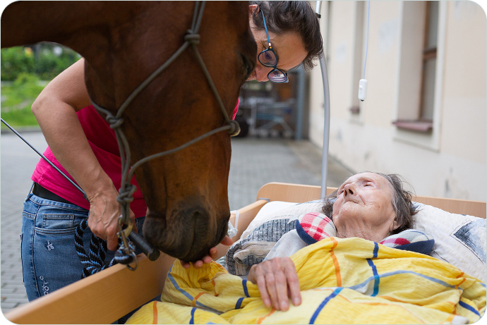 Naše terapie není o jízdě na koni. Je o vztahu, je o dotyku. Je o teplé srsti, klidném dechu zvířete, které nic nehodnotí. Přinášíme tento kontakt tam, kde by ho jinak nebylo, hospiců a domovů seniorů.